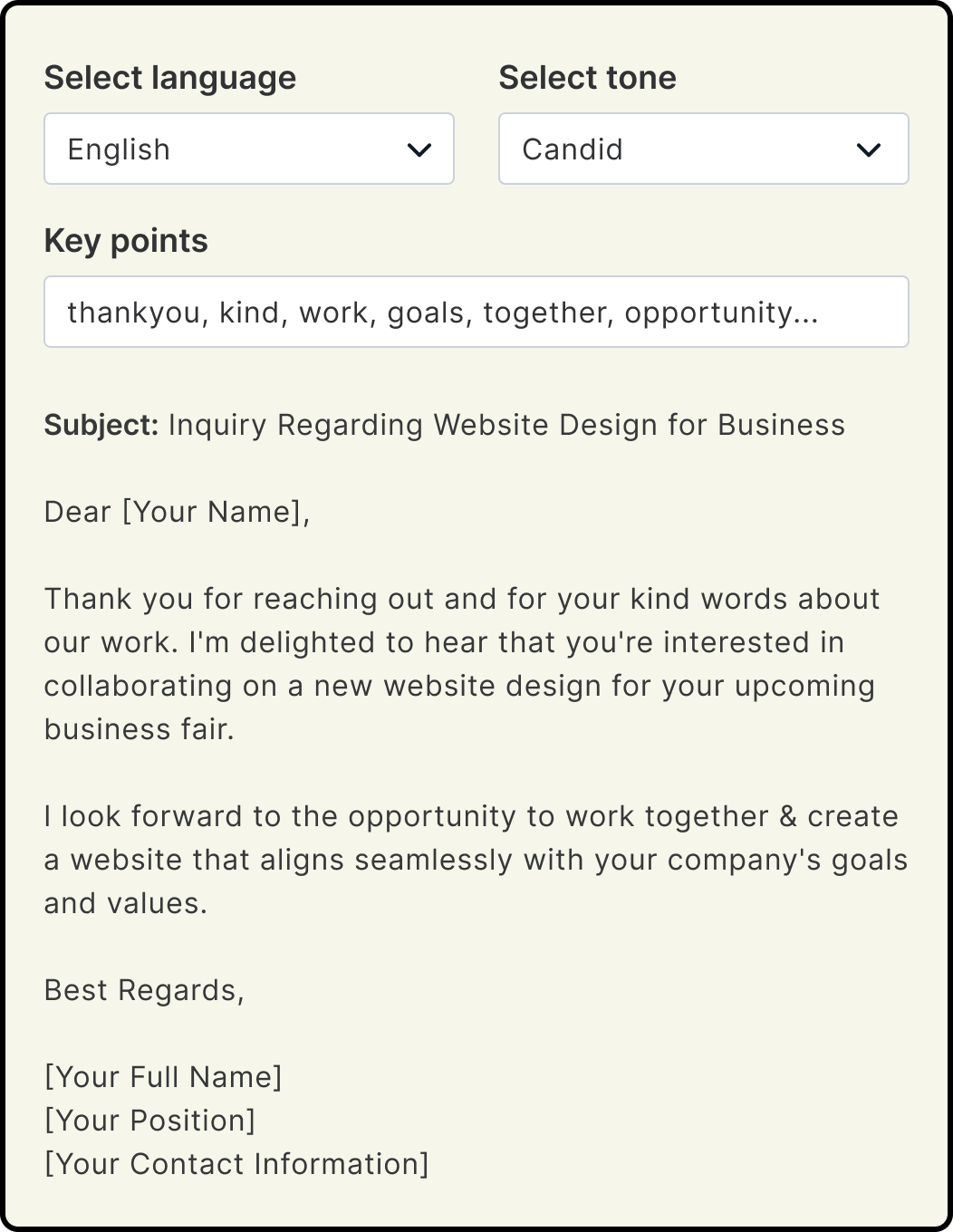 Users input the main purpose or subject of their email along with relevant input keywords.